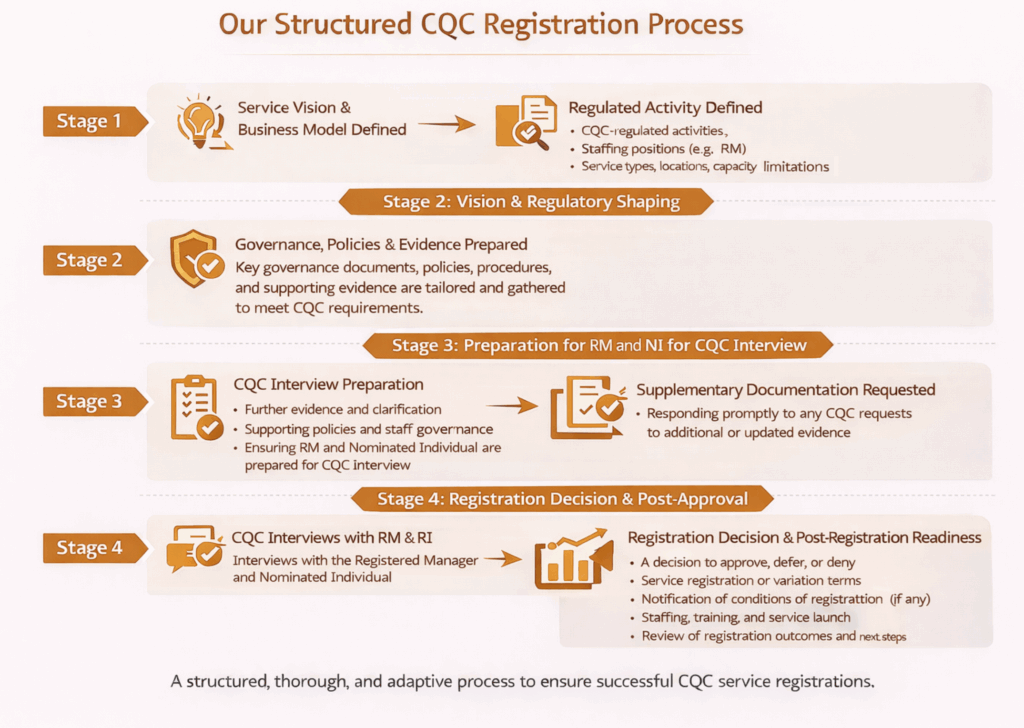 Our approach ensures that registration applications accurately reflect service intent and operational readiness, reducing the risk of delay, refusal or post-registration compliance issues.